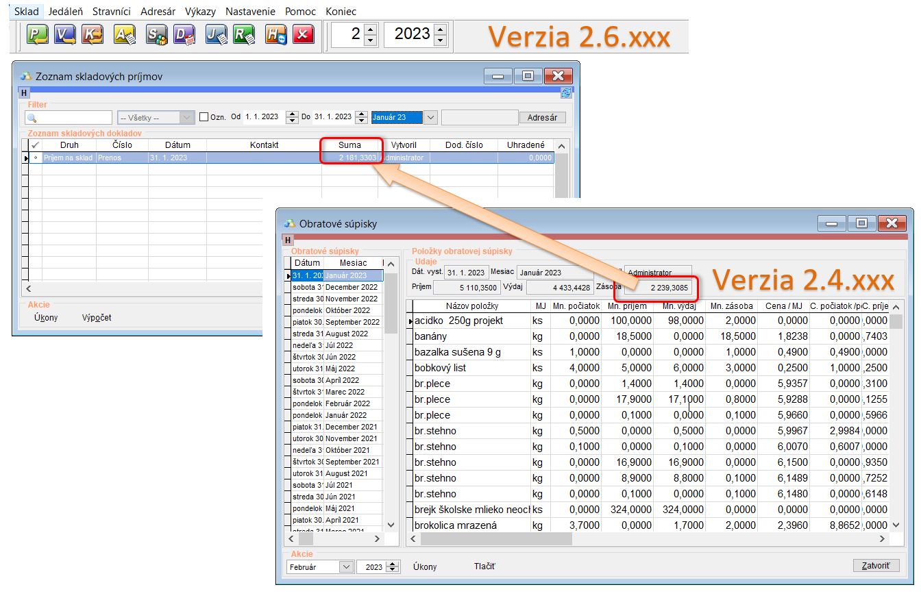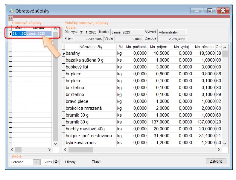 - Skladové zásoby - na základe poslednej obratovej súpisky sa prenášajú zostatky skladu ako počiatočný príjem. (Tento príjem je evidovaný k danému, alebo predchádzajúcemu mesiacu, v ktorom bola vytvorená pôvodná obratová súpiska.)