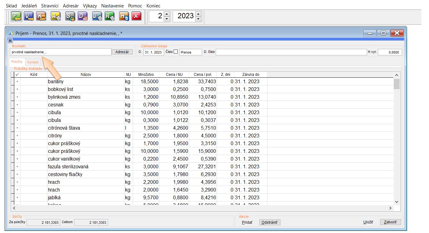 - Pozor, pri úprave je potrebné pred uložením vybrať kontakt. (Odporúčame vytvoriť kontakt Prvotné naskladnenie, alebo vybrať kontakt školy a pod.)