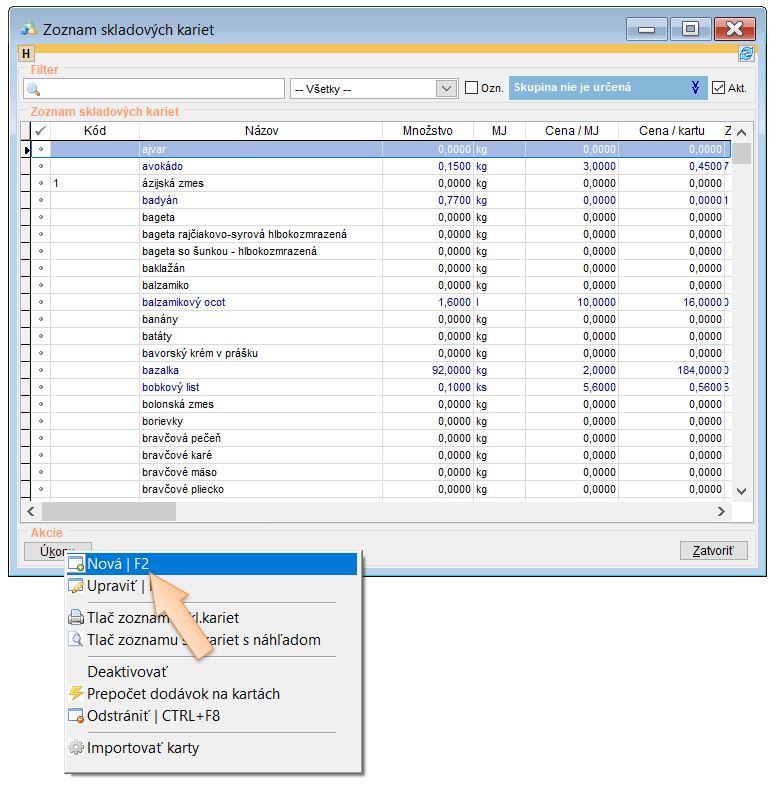 Takto vytvorenú skladovú kartu viete evidovať aj na sklade. Stačí vybrať dodávateľa, vyhľadať príslušnú kartu školského ovocia, zadať množstvo a nulovú cenu.