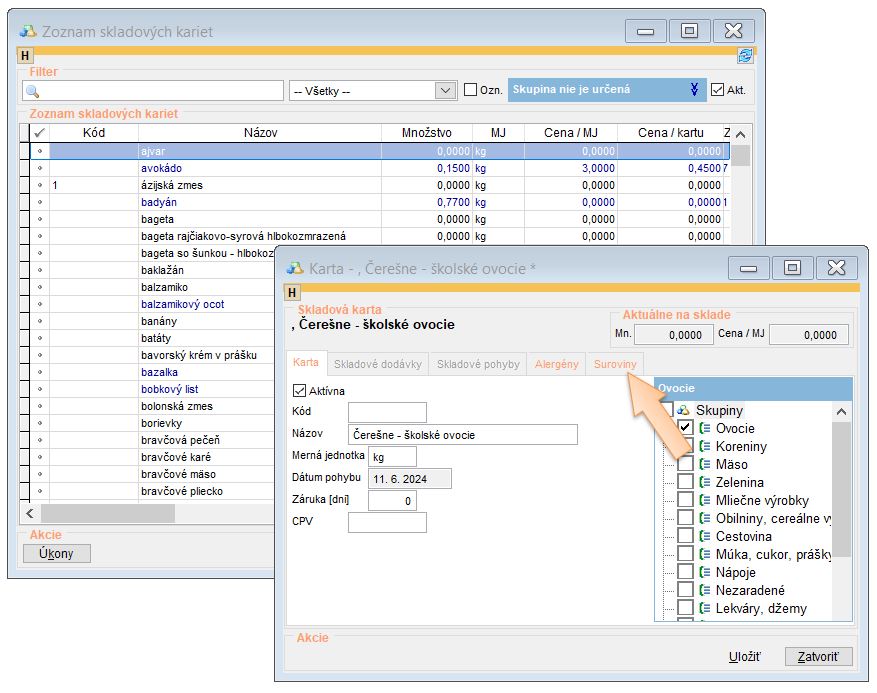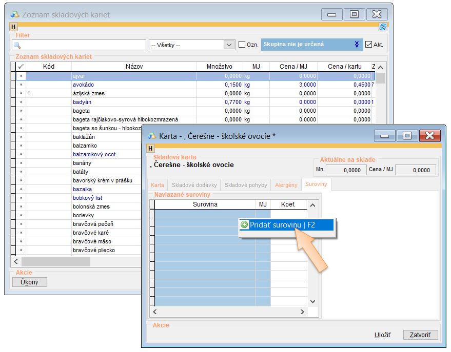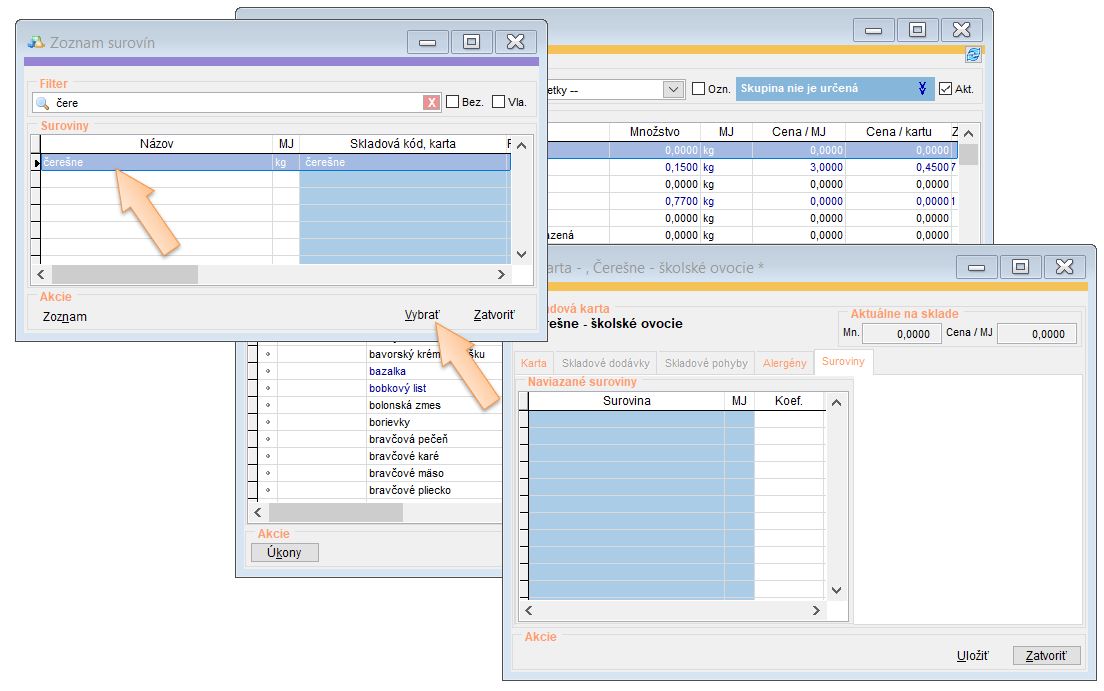 4. Kliknite na Pridať a vyhľadajte surovinu. (V našom prípade Čerešne - školské ovocie.)