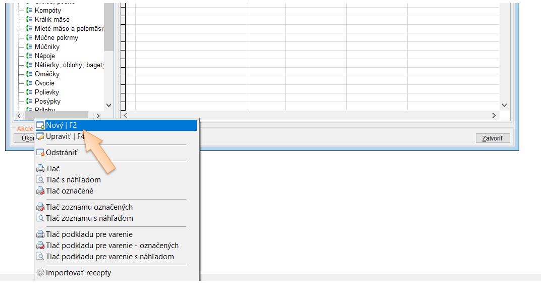 Vytvorenie karty receptúry pre výber na jedálny lístok