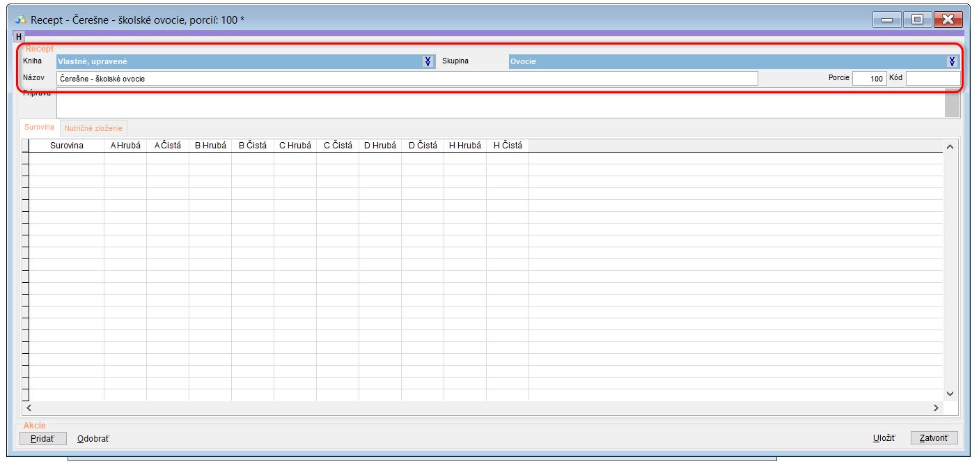 3. Vypňte Názov receptúry. (V našom prípade Čerešne - školské ovocie.)