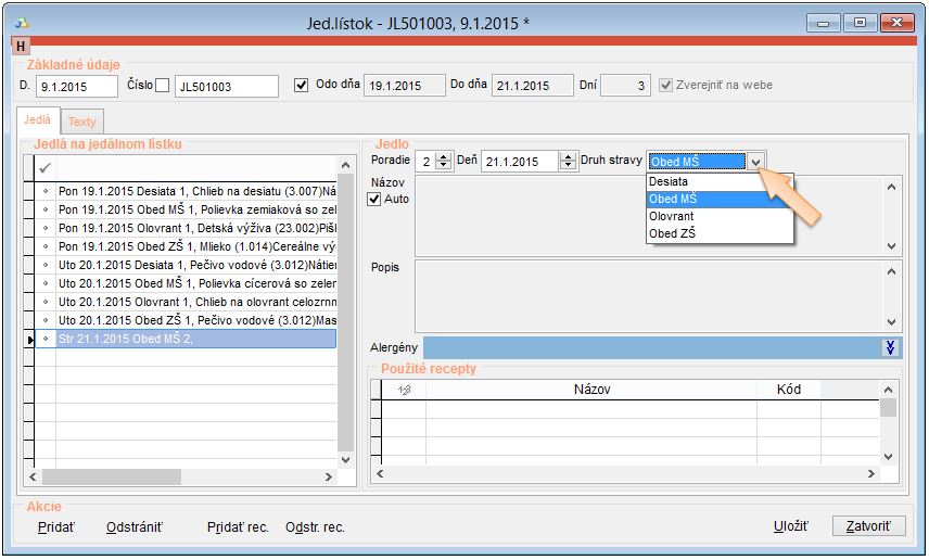 - Ak ste nadefinovali v nastaveniach v časti Číselné rady druhov aj nový druh pre Jedálne lístky, vyberte v stĺpci Druh jedálneho lístka aj nadefinovaný tento druh.