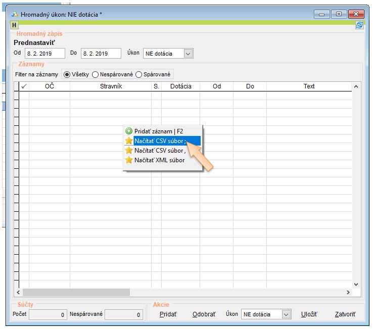 Evidencia dotovaných jedál - import dochádzky stravníkov