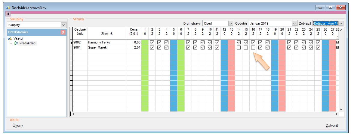 - Na dni, ktoré sú označené v zozname fajkou, stravníkovi je aplikovaná dotácia. (Ak sa v niektorom dni fajka nenachádza, stravník na tento deň nie je prihlásený, alebo nemá nárok na dotáciu.)s