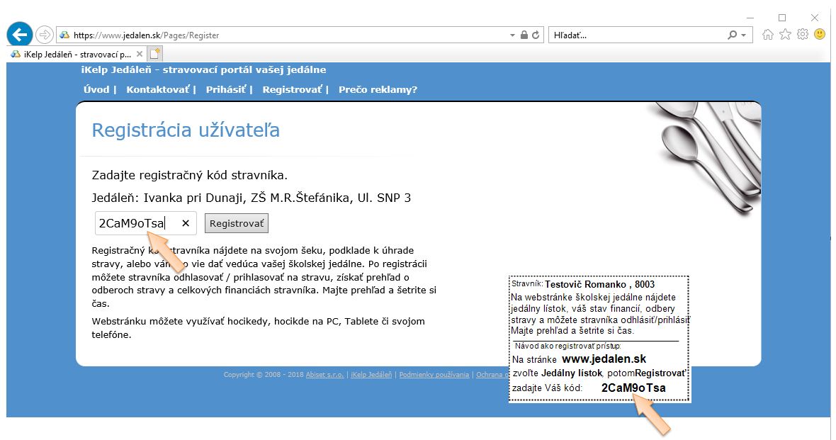 Ak ste na podklade k úhrade našli vytlačený prístupový kód na stránku www.ikelp.sk je možné sa pomocou kódu zaregistrovať a získať tak prístup do webovej jedálne a využívať všetky výhody ktoré stránka ponúka.