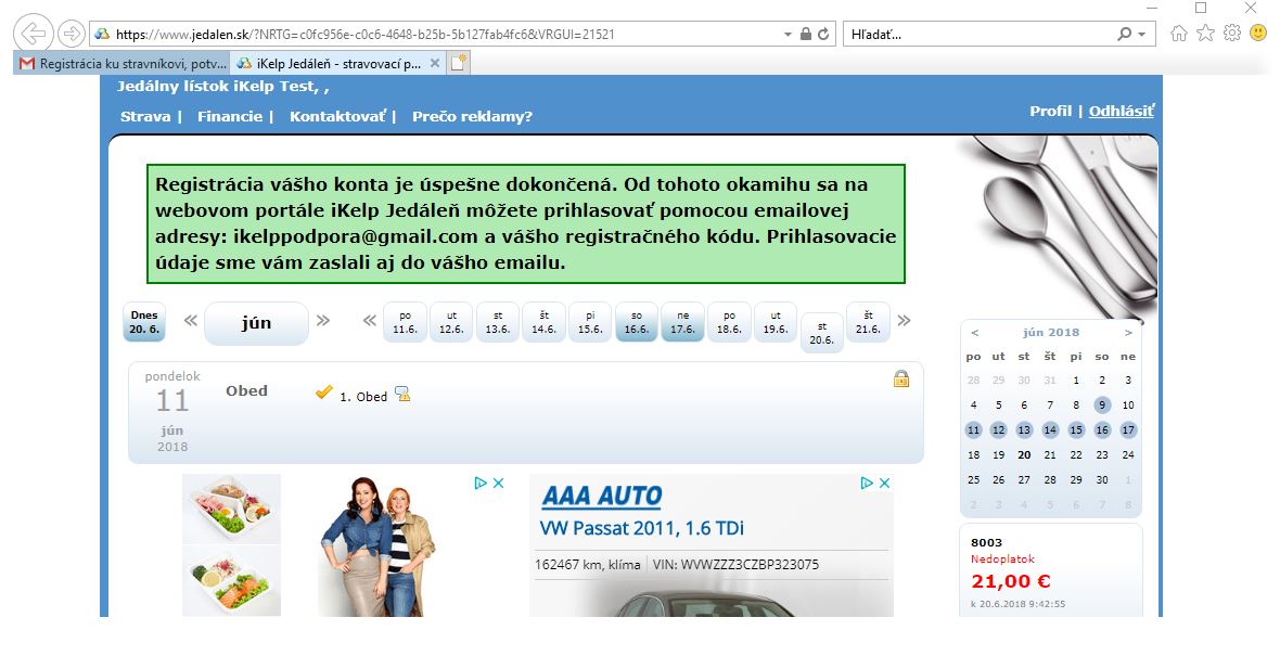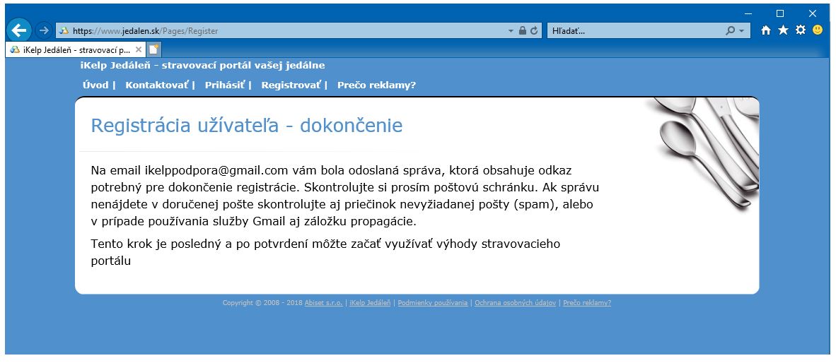• Po kliknutí na odkaz sa zobrazí správa o potvrdení úspešnej registrácie.