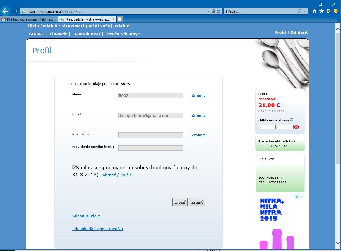 • Po prihlásení sa na portál webovej jedálne je možné si v záložke Profil zmeniť zobrazované meno stravníka, email a heslo. Zmenu odporúčame vykonať hlavne v prípade, že pod jedným účtom je evidovaných viacero stravníkov, čím je ich možné jednoduchšie identifikovať. Či si však číslo zmeníte na meno, prezývku alebo akýkoľvek iný údaj je len na rozhodnutí prihláseného užívateľa. Tieto údaje sa následne nikam neposielajú a slúžia len na to, aby ste jednoduchšie vedeli toho ktorého stravníka identifikovať.