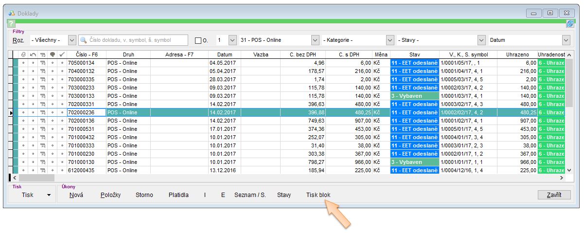 • Opětovné odeslání dokladu na zařízení vykonáte kliknutím na tlačítko Tisk blok v seznamu finančních dokladů.