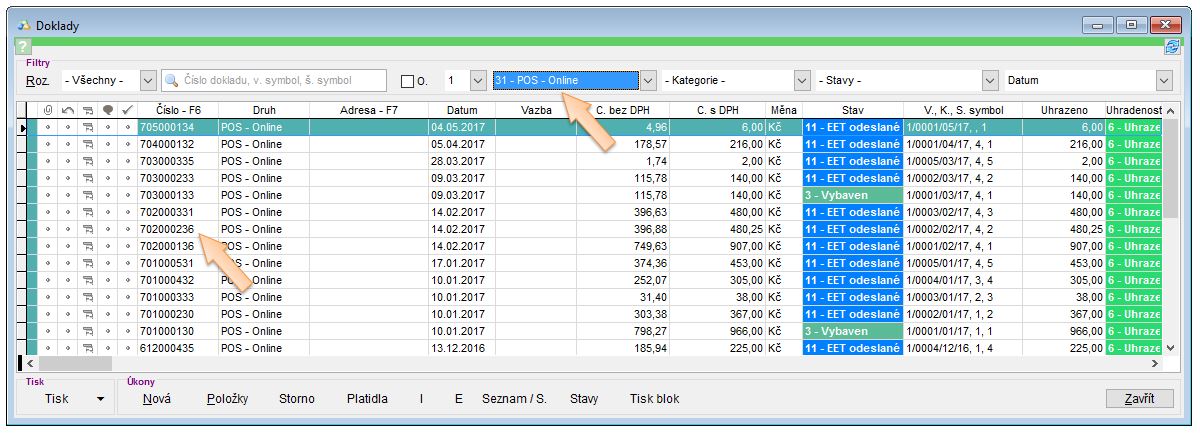 • Tip: Pro urychlení vyhledávání v seznamu dokladů napište číslo dokladu, případně si pomocí filtru Druhy vyfiltrujte jen na doklady typu ECR - On line nebo POS - Online.