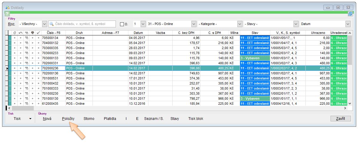 2. Úpravu dokladu vykonáte kliknutím na daný doklad (tím se označí) a následným kliknutím na tlačítko Položky v části Úkony.