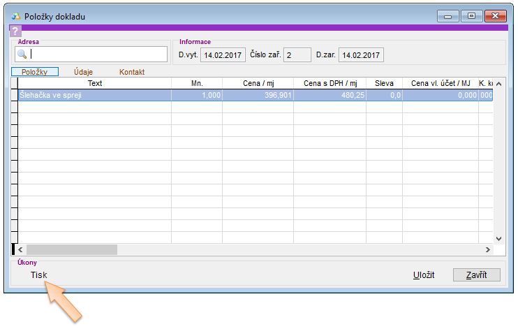 • Tisk - odeslání dokladu na zařízení. Při této operaci se doklad opětovně odešle na zařízení i do EET a započítá se do obratů, avšak nevzniká žádný pohyb ve skladu. Toto se používá tehdy, když byl v aplikaci při prodeji vytvořen doklad, ale při jeho posílání do tiskárny vznikla chyba (došla páska, odpojila se tiskárna apod.) a tiskárna doklad nevytiskla a zůstal ve stavu tzv. Odložený, ale do aplikace se zapsal. Je možné ho tak opětovně odeslat na zařízení.