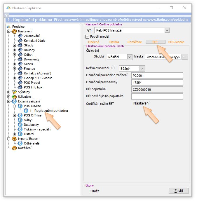 2. Vyberte konfiguraci daného fiskálního zařízení (pokladny) a klikněte na tlačítko Nastavení v záložce EET.