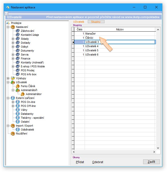 Skupinu uživatelů je vhodné vytvořit, jestliže budete mít více uživatelů, kterým je potřebné nastavit stejná práva v aplikaci. (Jsou to např. číšníci, pokladníci apod.) Následně se práva nenastavují pro konkrétního uživatele, ale pro skupinu uživatelů. Automaticky se tak aplikují všem z dané skupiny. Rovněž je tak zjednodušené vytváření nových uživatelů, kdy se nastaví jeho přihlašovací údaje a zařazením do skupiny se mu aplikují všechna potřebná práva.