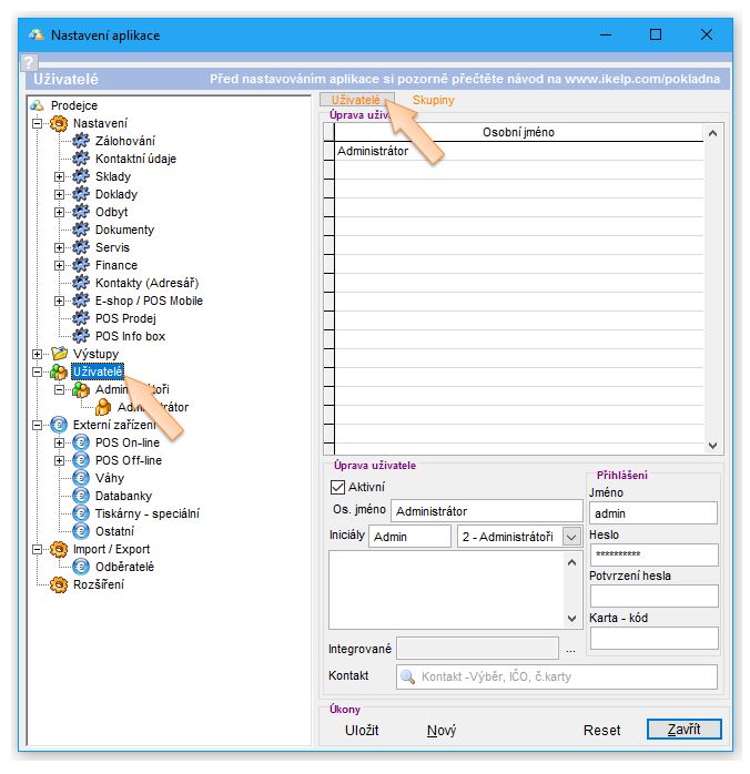 - Uživatel "Administrátor" se nachází ve skupině "Administrátoři" a práva jsou tak na uživatele aplikována z dané skupiny. Práva je možné skupině nastavit kliknutím na název skupiny ve stromu nastavení aplikace.