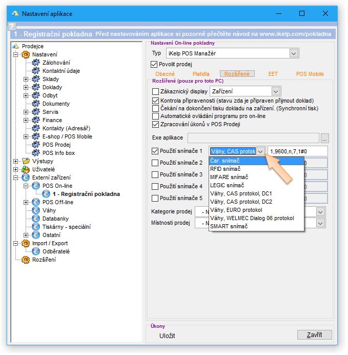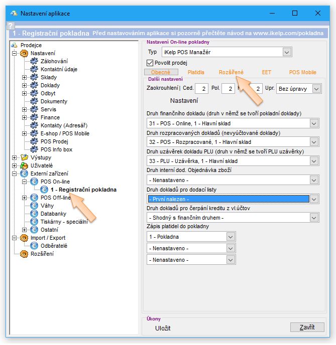 3. V levé části okna, ve stromu jednotlivých nastavení vyberte možnost Externí zařízení -> POS Online -> Registrační pokladna.