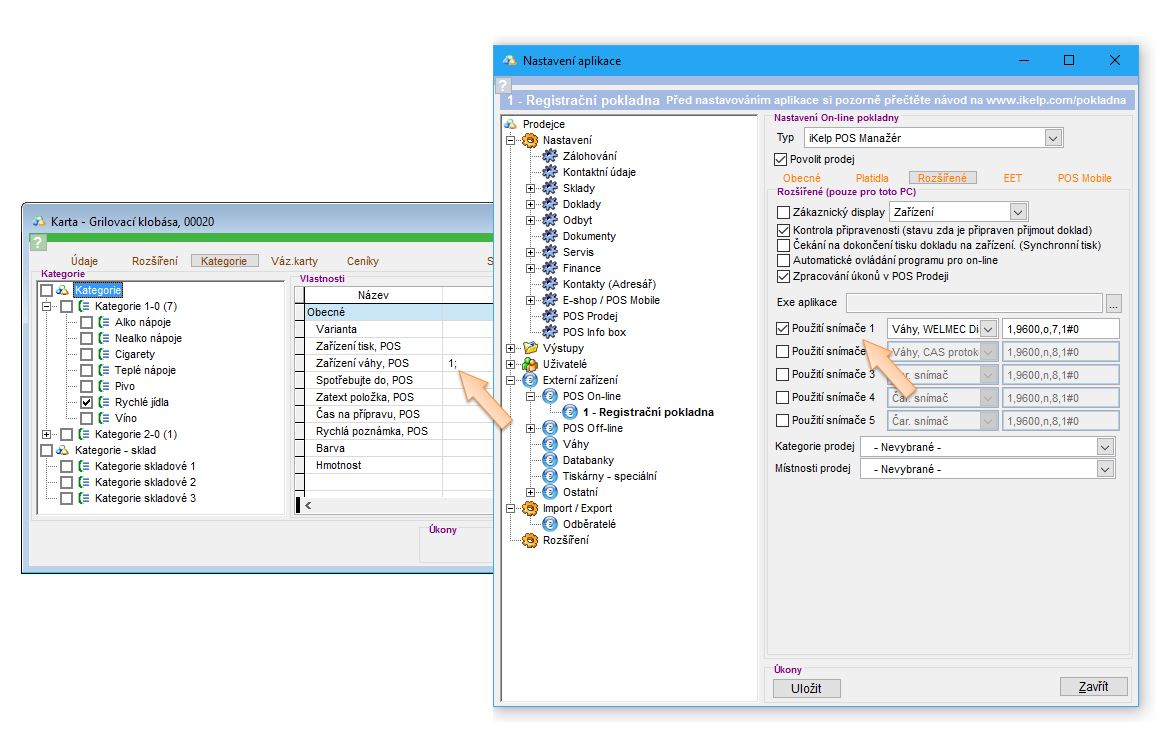 V případě, že máte k pokladně připojenou víc než jednu váhu, je potřebné skladovým kartám definovat, ze které váhy při výběru konkrétní položky bude aplikace očekávat zaslání informace o hmotnosti této položky. V nastaveních pořadové číslo váhy definuje číslo Použití snímače. Číslo váhy následně na skladové kartě nastavíte v záložce Kategorie -> Zařízení váhy, POS.