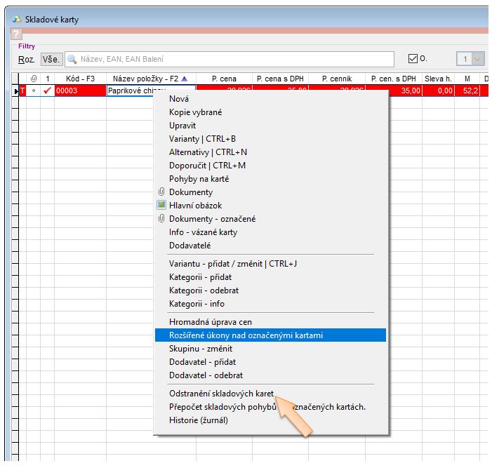 - Označte skladovou kartu, kterou chcete vymazat a pravým tlačítkem myši klikněte do seznamu karet např. v sloupci "Název položky".