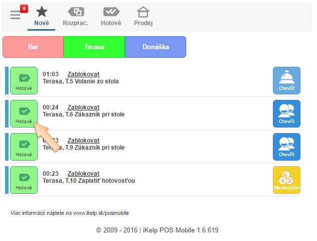 - Zoznam aktívnych notifikácií je možné filtrovať na jednotlivé miestnosti, kliknutím na ikonu je možné zmeniť ich stav na Rozpracované alebo Hotové. V príslušnej záložke je potom možné zobraziť rozpracované, alebo hotové notifikácie. Akonáhle je doklad ukončený, notifikácie sú zo systému odstránené.