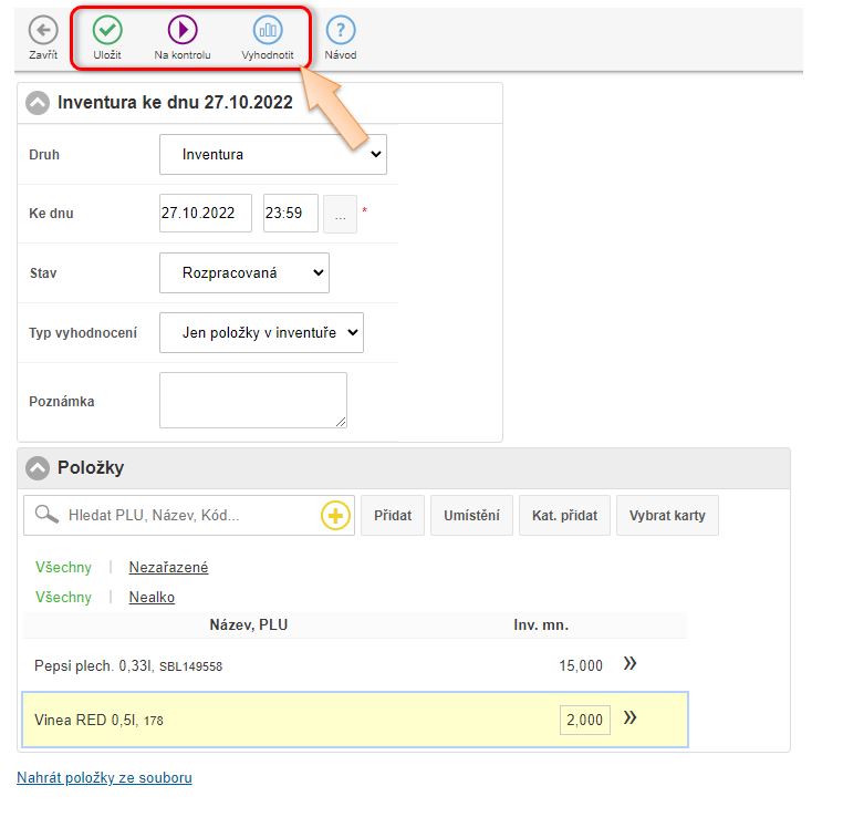 - Uložit - uložit inventuru pro pozdější zpracování.