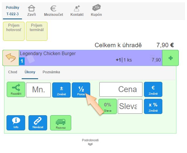 - Pro zadání polovičního množství klikněte na ikonu 1/2 Porce.