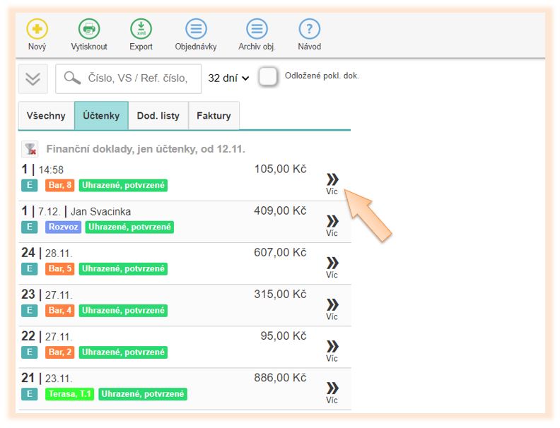 - Klikněte v menu aplikace na Historie dokladů.