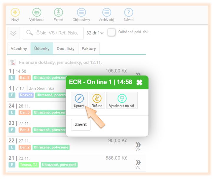 - Vyhledejte v seznamu doklad a klikněte na Více, následně Upravit.