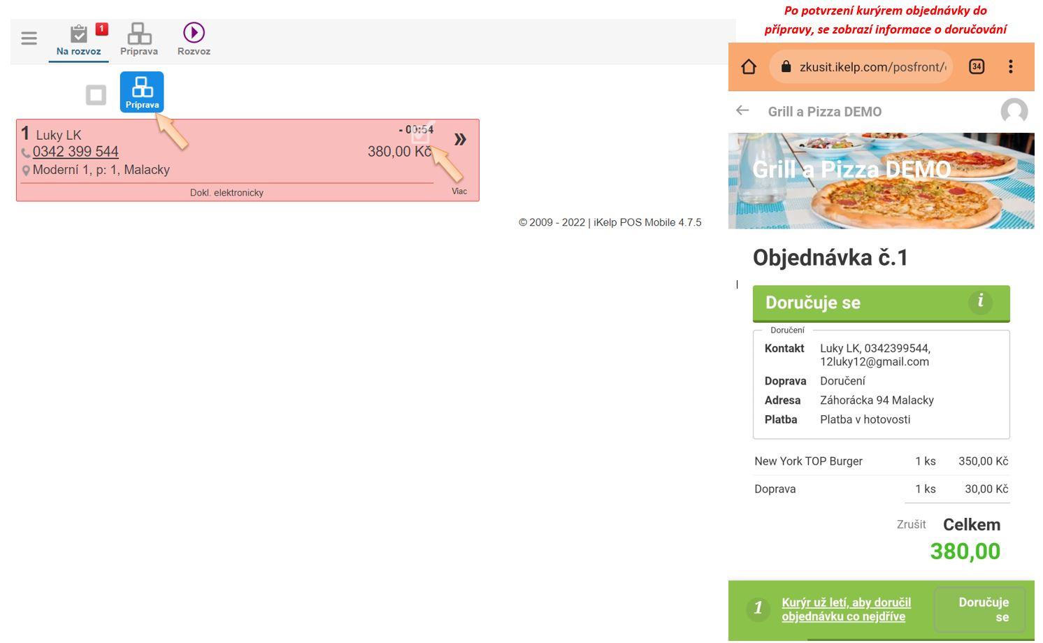 - Zákazník vytvoří online objednávku a vidí stav Přijatá, Čeká se na obsloužení personálem. (Pro svou oblast doručení vidí např. 45min.)