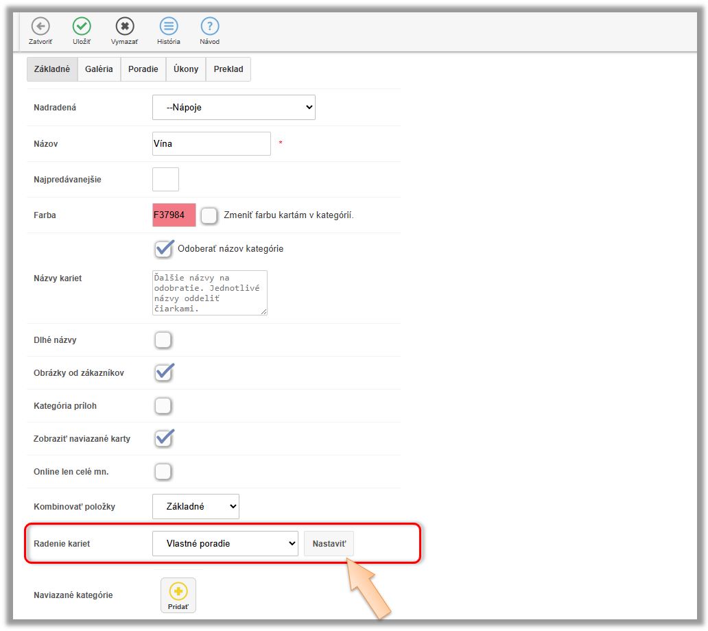 Radenie položiek sa nastavuje v rámci jednotlivých kategórií, kde je možné definovať, ako sa budú položky po rozkliknutí kategórie zobrazovať.