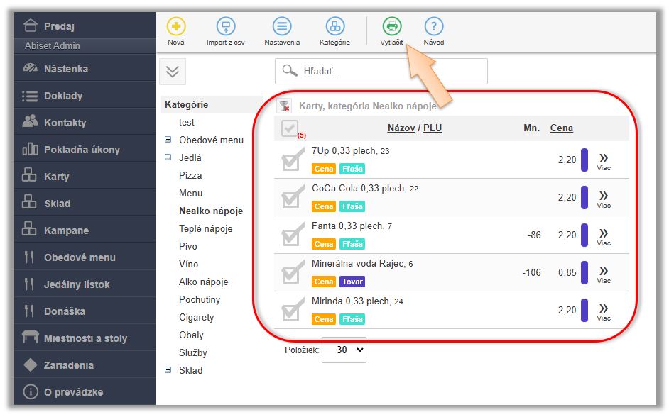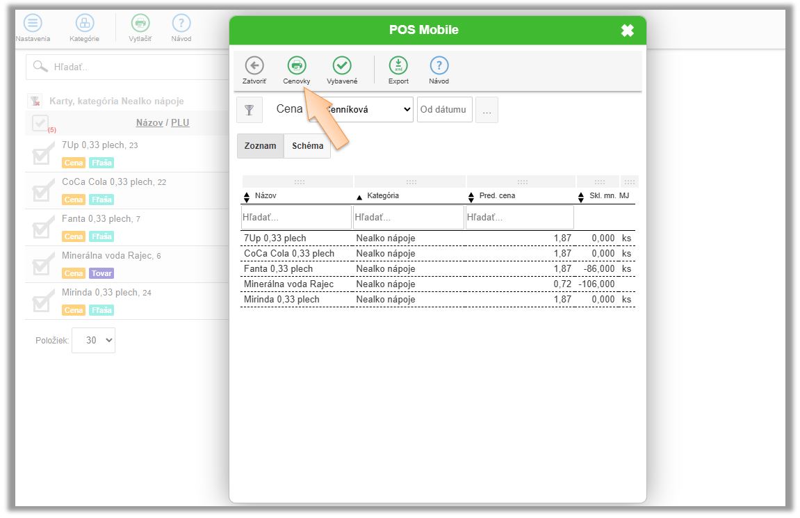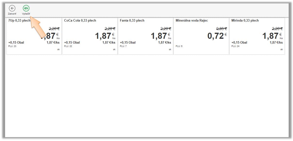 • Nastavte si požadované parametre pre tlač. (Napr. výberom ceny na cenovke Základná/Cenníková/Rozvoz.)
