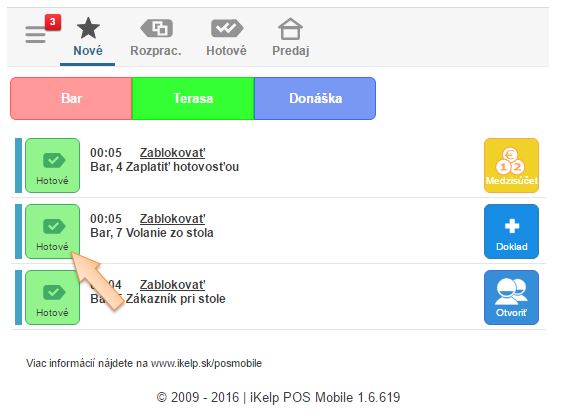 - Zoznam aktívnych notifikácií je možné filtrovať na jednotlivé miestnosti, kliknutím na ikonu je možné zmeniť ich stav na Rozpracované alebo Hotové. V príslušnej záložke je potom možné zobraziť rozpracované, alebo hotové notifikácie. Akonáhle je doklad ukončený, notifikácie sú zo systému odstránené.