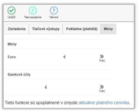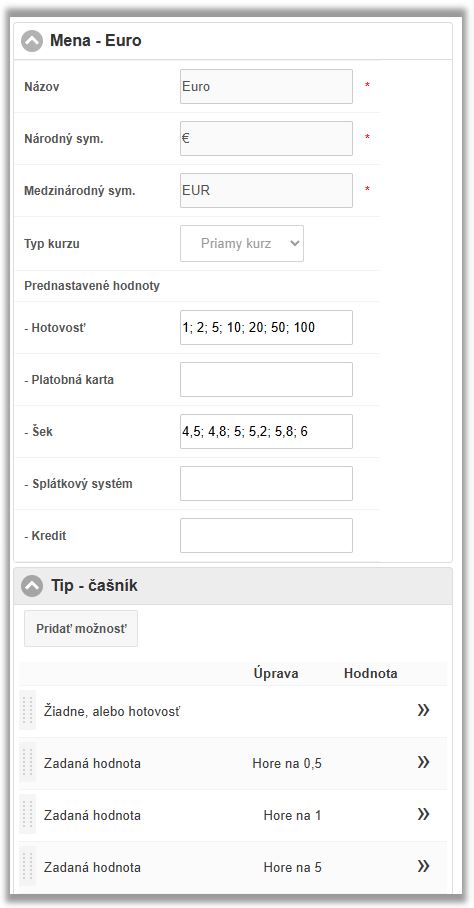 • Meny - definovanie meny a prednastavených hodnôt pre danú pokladňu a menu. Tieto hodnoty sa následne zobrazujú pri ukončovaní dokladu, kde si obsluha vie vybrať z jednotlivých platidiel pre úhradu.