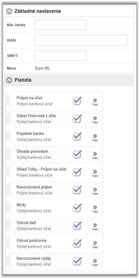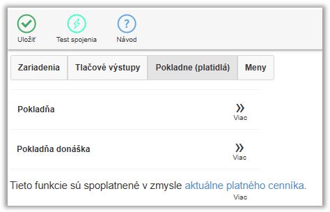 • Pokladne (platidlá) - definovanie jednotlivých platidiel pre danú pokladňu, aké platidlá má systém ponúkať pri platbe, či sa v danej pokladni používa aj prepojený platobný terminál a pod.