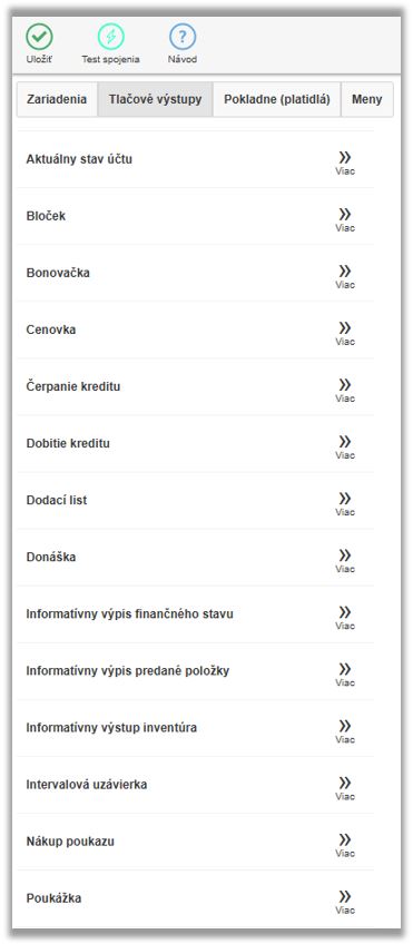 • Tlačové výstupy - jednotlivé tlačové výstupy, možnosť definovať, čo sa na ktorom výstupe má / nemá tlačiť, možnosť definovania výstpu pre konkrétne zariadenia (teda napr. pre konkrétnu bonovaciu tlačiareň je možné definovať, ktoré údaje sa na bone majú zobrazovať), možnosť nadefinovať, či sa má / nemá tlačiť doklad ukončený ako rozpracovaný a pod.