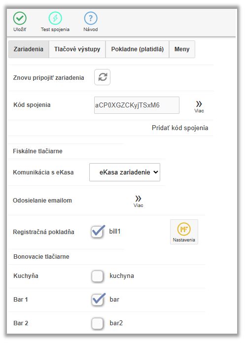 V tomto článku vám vysvetlíme jednotlivé nastavenia Online zariadení (fiskálnych a bonovacích tlačiarní) v iKelp POS Mobile. Nastavenia zariadení je možné zobraziť v Menu aplikácie, kliknutím na tlačidlo Zariadenia. Postup prepojenia aplikácie iKelp POS Mobile s online zariadeniami je popísaný v časti Registračná pokladňa - Kód spojenia.