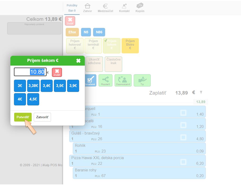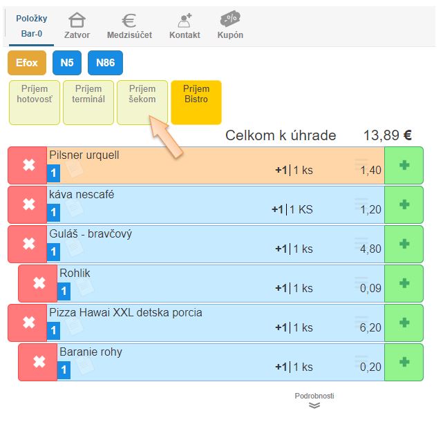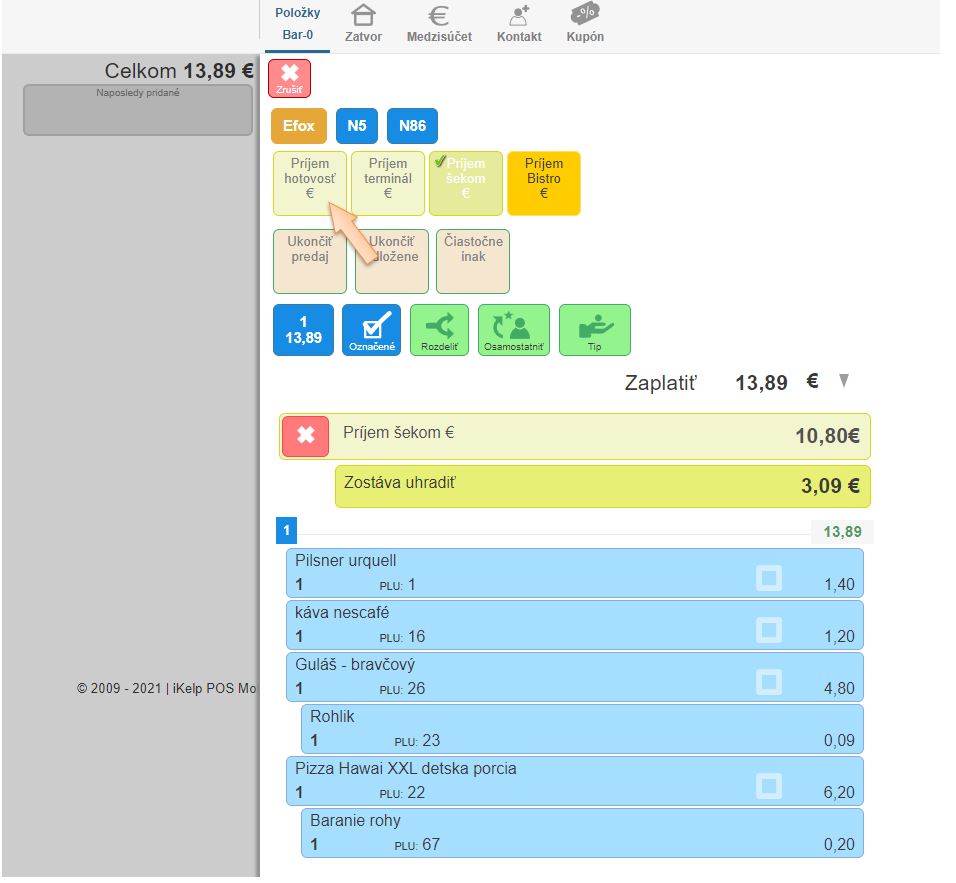 - Kliknite na ikonu platidla pre doplatenie zvyšnej sumy, napr. Príjem hotovosť.