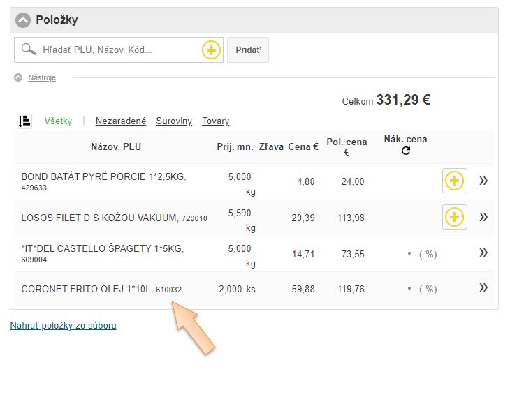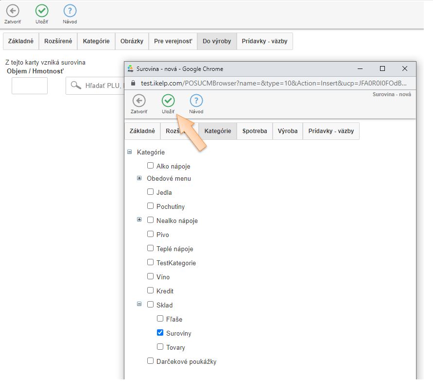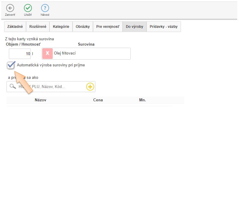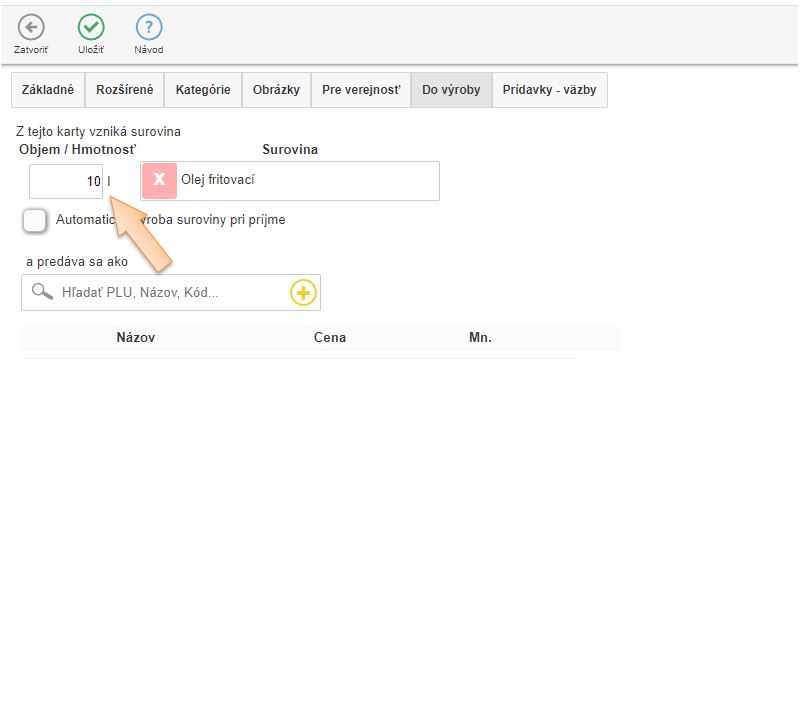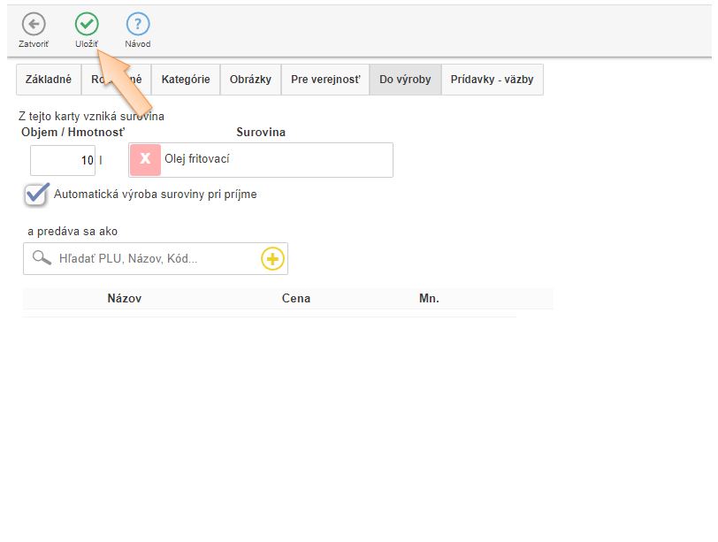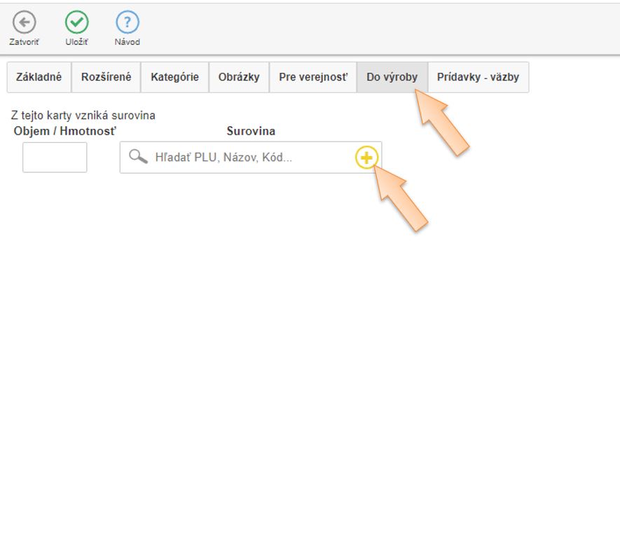 4. V záložke Do výroby kliknutím na ikonu + vytvorte kartu suroviny používanej na výrobu receptúr.