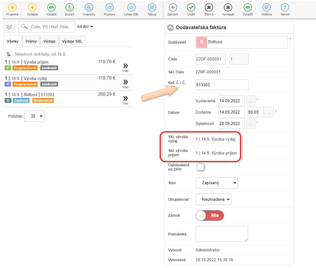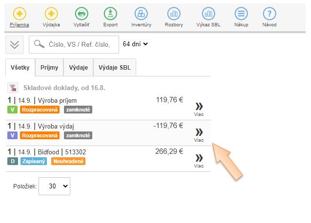 Po uložení skladového dokladu aplikácia automaticky vytvorí skladový výdaj s názvom Výroba výdaj, ktorou sa vydá prijatý tovar zo skladu a spraví sa automatický príjem na nadefinovanú surovinu v danom objeme pod druhom Výroba príjem. Tieto doklady sú vidieť aj v zozname skladových dokladov, a po rozkliknutí je možné si pozrieť väzbu medzi týmito dokladmi.