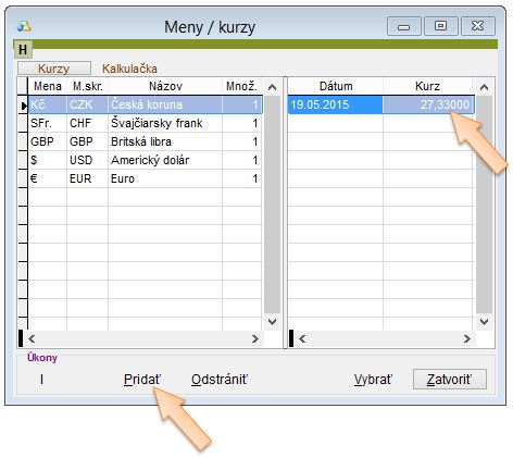 - Kliknutím na tlačidlo Pridať nadefinujte aktuálny kurz. (Pri výpočte Vám môže pomôcť aj Základná menová kalkulačka, ktorá sa zobrazí po kliknutí na záložku Kalkulačka.)