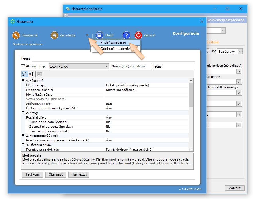 - Zobrazte konfiguráciu daného fiskálneho zariadenia (tlačiarne) a kliknite na tlačidlo Nastavenia v záložke Všeobecné.