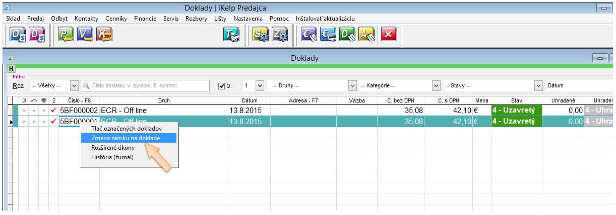 - Kliknite na daný doklad v stĺpci "Číslo" pravým tlačidlom myši.