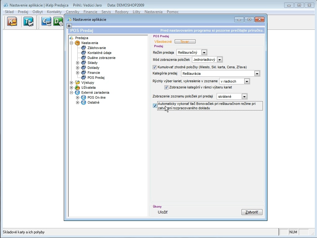 - Klikneme na menu Nastavenia, Nastavenia, vojdeme do sekcie POS Predaj, záložka Tovar a zvolíme voľbu Automaticky vykonať tlač Bonovačiek . Po pridaní položky do dokladu, ktorá má nastavenú tlač na niektorú z tlačiarní, dôjde k automatickému vytlačeniu objednávok na daných zariadeniach.