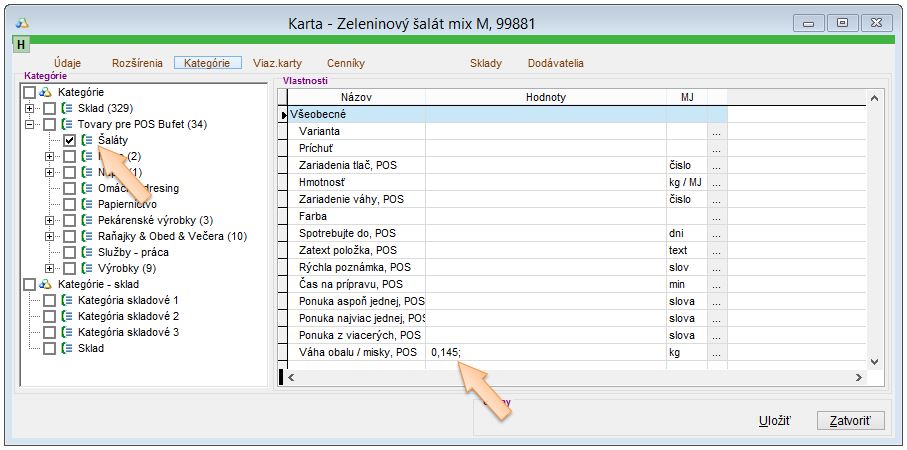- Po zaradení karty do kategórie sa v záložke Kategórie na skladovej karte zobrazí rozšírená vlastnosť "Váha obalu / misky, POS".