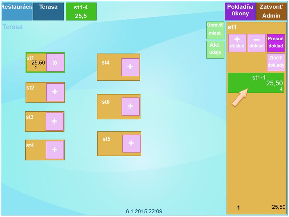 Na jednom stole môže byť aj viacero otvorených dokladov, resp. je možné presunúť otvorený účet aj na stôl, na ktorom je už otvorený iný účet. Tieto je následne v prípade potreby možné zlúčiť do jedného dokladu (vytvoriť spoločný otvorený účet). Postup zlučovania dokladov sa dočítate v článku Dotykový predaj - Zlúčenie dokladov (otvorených účtov).