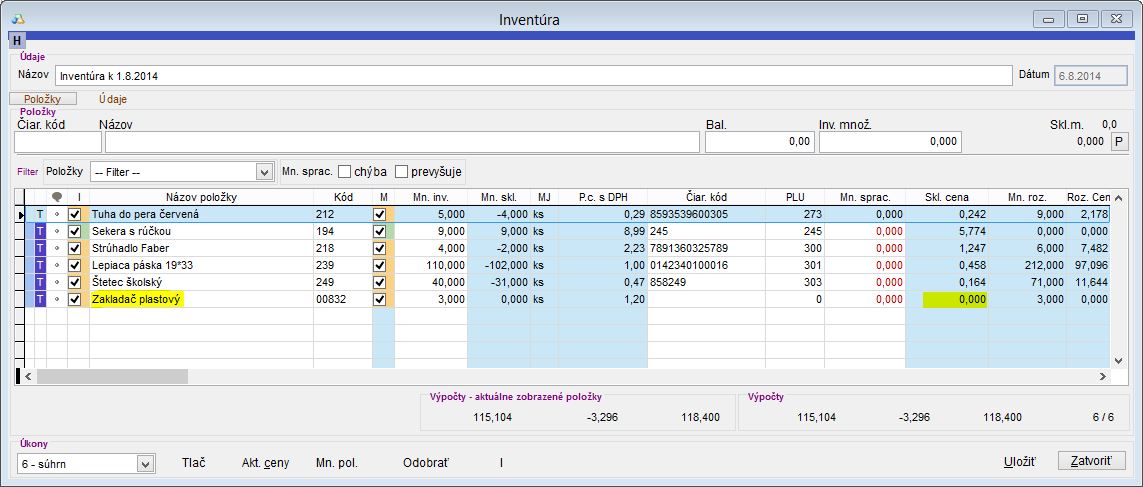 Hlásenie aplikácie: Inventúra obsahuje položku s nulovou skladovou cenou!