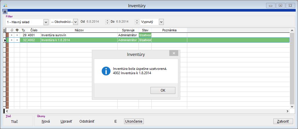 Úspešné uzatvorenie inventúry po vykonaní aktualizácie a úprave skladových cien.
