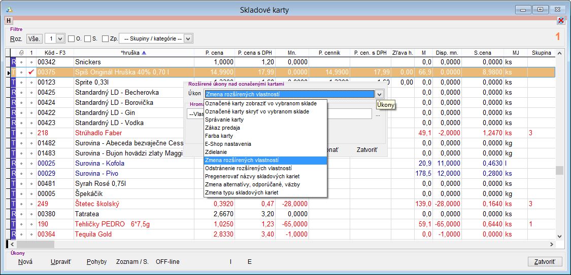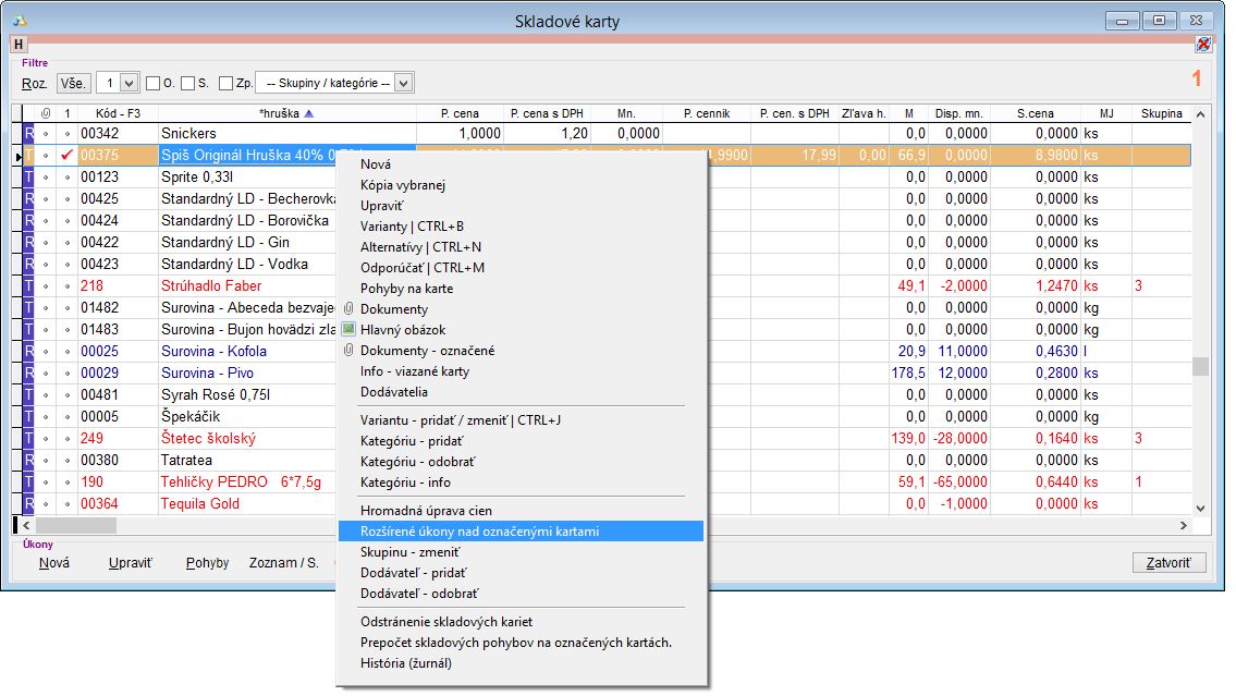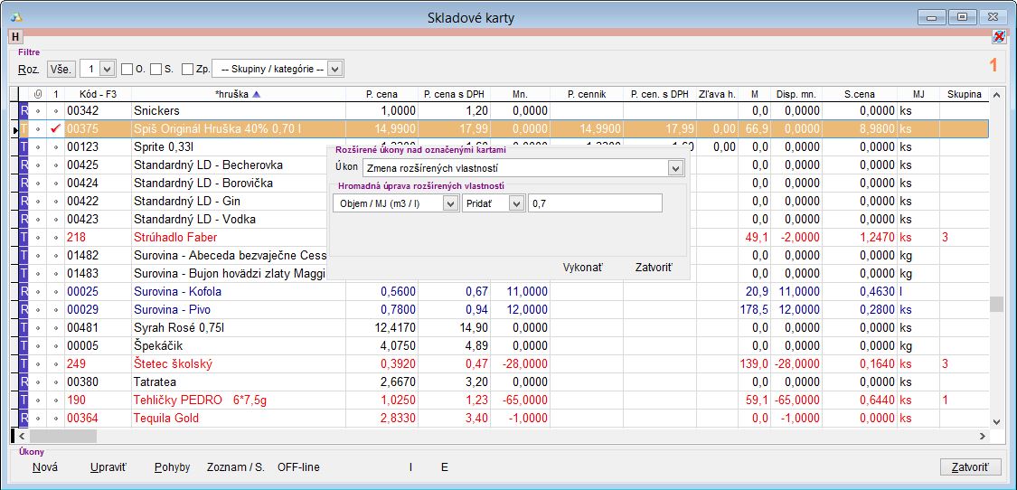 Skladové karty - stromové kategórie. Rovnako je možné kartám priradiť aj hromadne parametre "Objem v MJ" a "Obsah alkoholu" zo záložky rozšírené. Hromadnú úpravu je možné vykonať pomocou funkcie "Rozšírené úkony nad označenými kartami".
