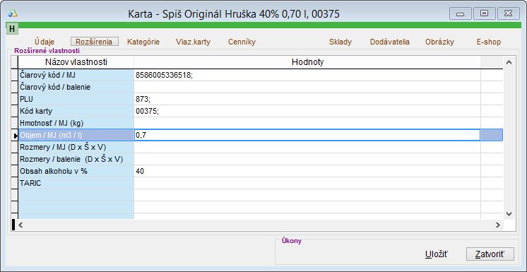Pozor, ak údaje "Objem" a "Obsahu alkoholu" zo záložky Rozšírenia nebudú vyplnené, daná karta sa nezapočíta do výkazu alkoholu! Preto je potrebné ich zadať na všetkých skladových kartách, ktoré vstupujú do výkazu alkoholu. (Pozor napríklad víno do alkoholu z pohľadu výkazov nespadá, takže Cinzano sem nepatrí). Tieto hodnoty uvádzajte správne, nakoľko ich zlé uvedenie má za následok nesprávne vypočítané hodnoty na výkaze alkoholu. Neskoršie zistenie tejto chyby vyžaduje pracné opravy.