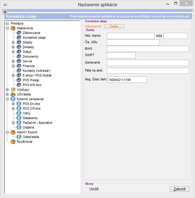 - V záložke "Všeobecné" je potrebné vyplniť základné obchodné údaje o Vašej spoločnosti.