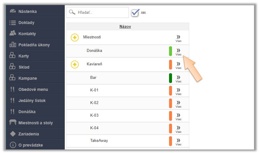1. V menu aplikácie vyberte možnosť Miestnosti a stoly.